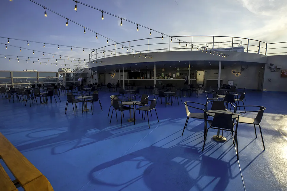 La zona esterna della nave è raggiungibile al ponte 11, dove al centro si trova il Bar, con molti tavoli (circa 100) e altrettanti posti ove potersi sedere e godere di prodotti quali insalate, panini ma anche estratti di frutta e verdura.