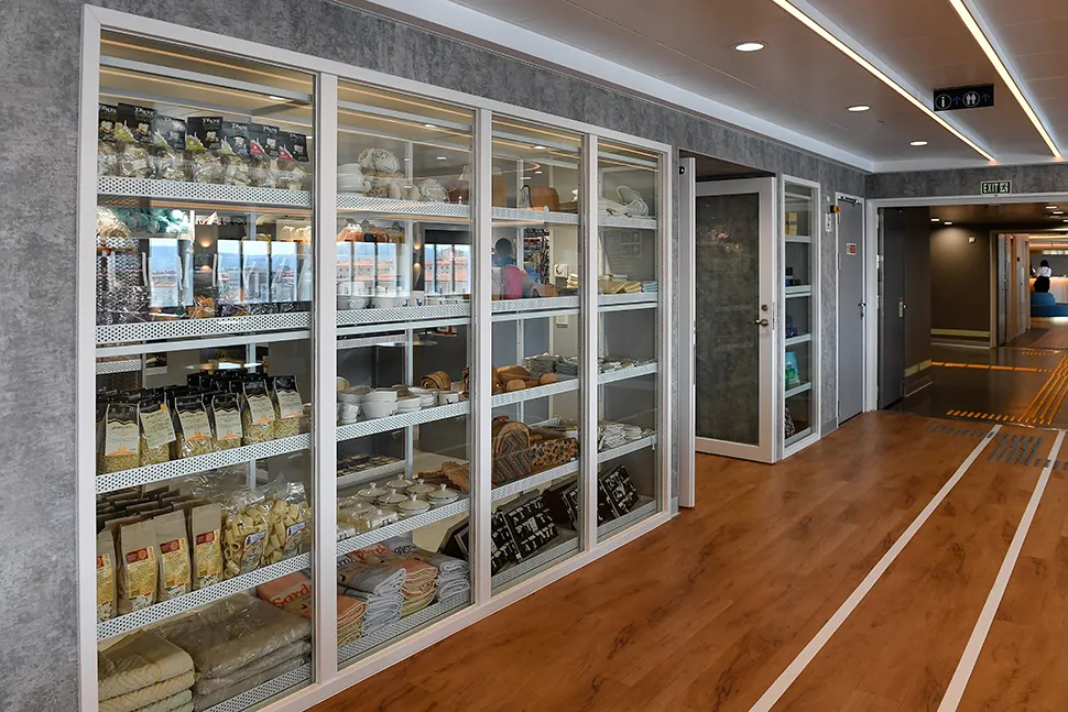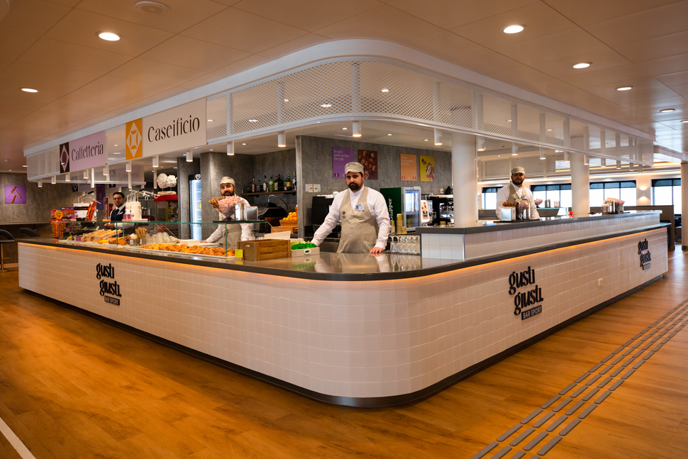 Complessivamente: 7 punti ristoro, 15 aree con offerte diversificate per un totale di oltre 50 metri lineari di espositivi di vetrine - pinseria, salumeria, pastificio con prodotti freschi preparati a bordo, fino alla cocktaileria e all’angolo goloserie per i più piccoli - servizi in funzione senza sosta per tutta la durata del viaggio, possibilità di take away e acquisto di prodotti d’eccellenza e, non ultimo, innovative tecnologie salta code.
